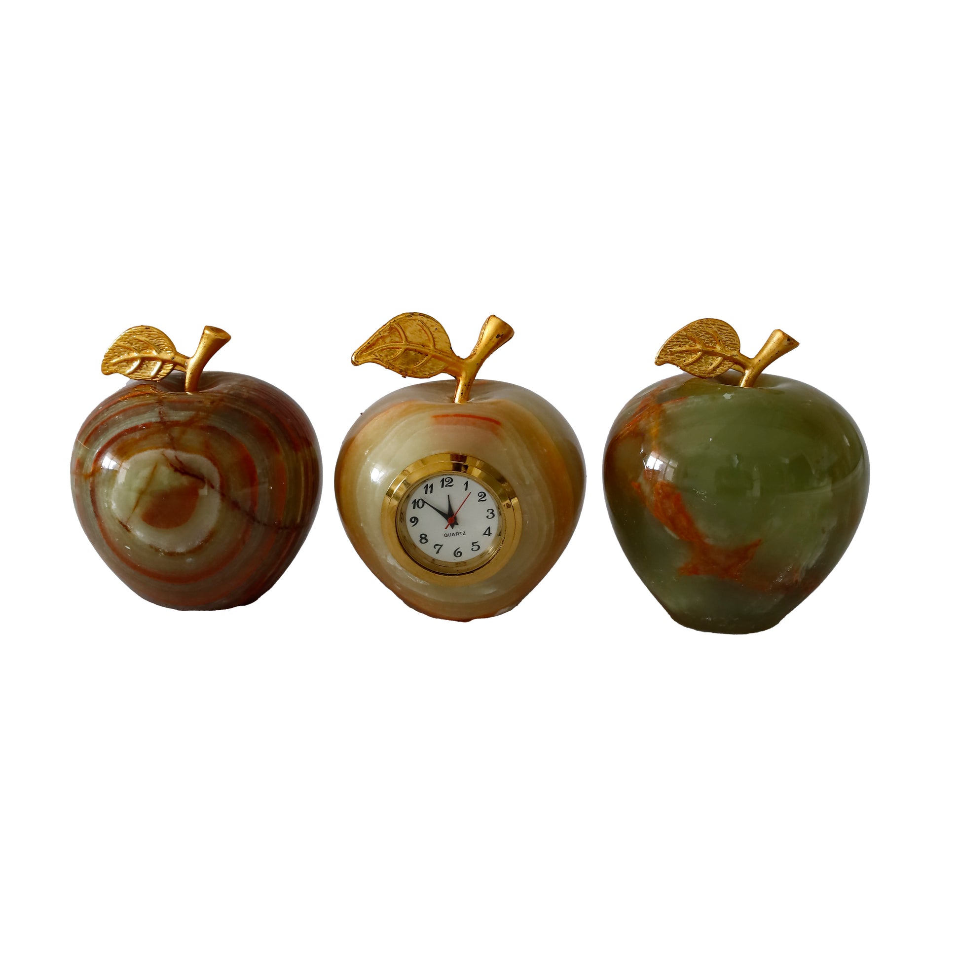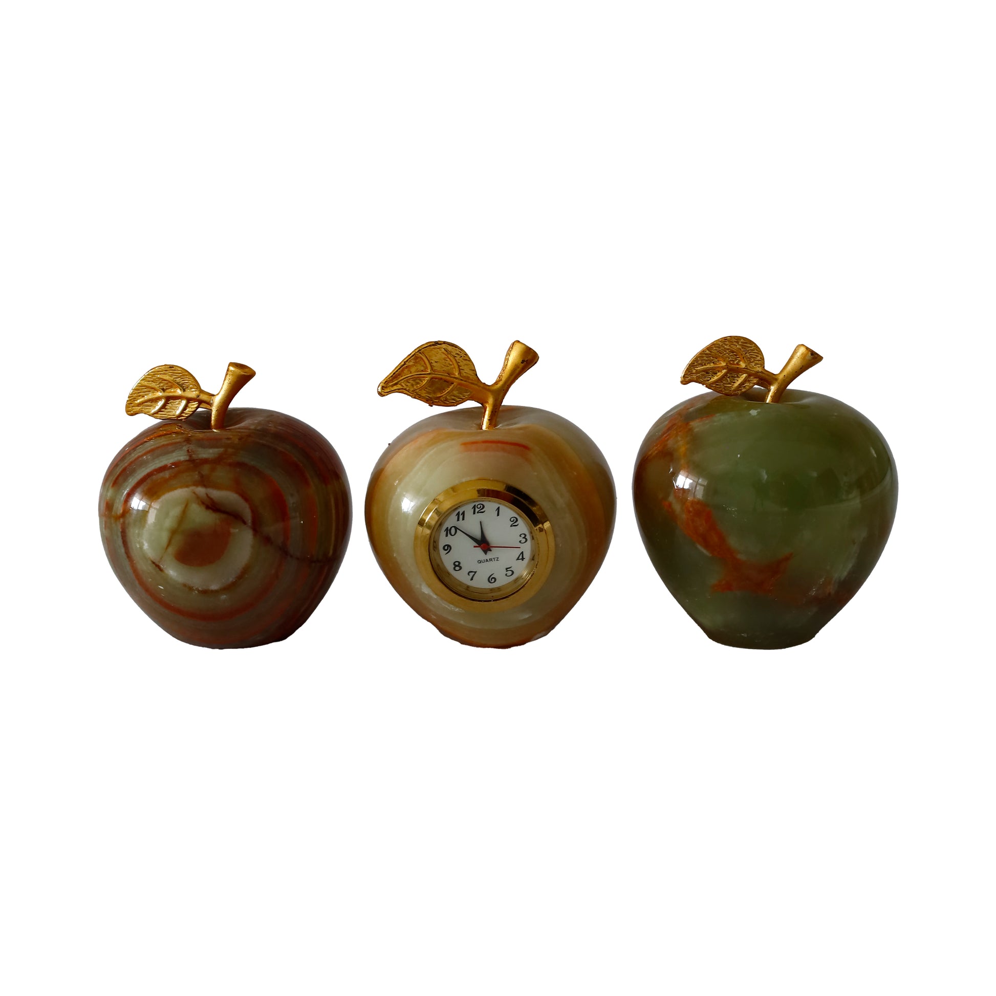 Doğal Oniks Taşından 2 Adet Elma Biblo ve 1 Adet Elma Saat - 2 İnç Dekoratif Set